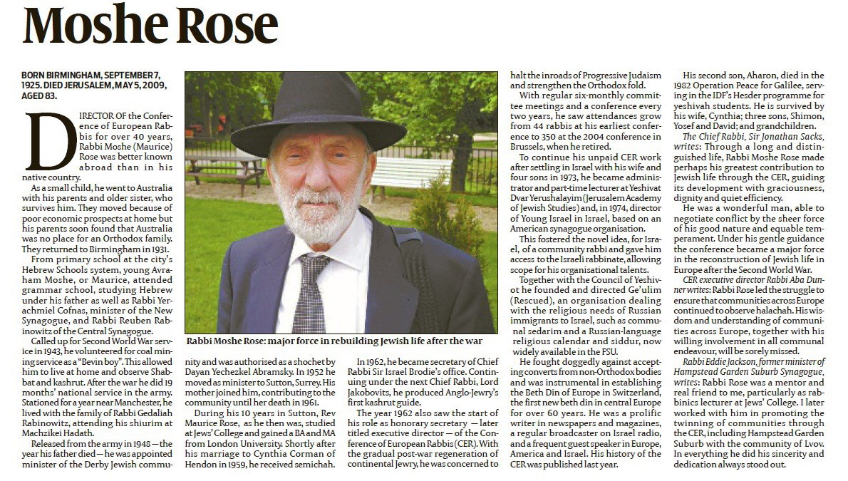 Rabbi Moshe Rose Obituary 29 May 2009 (jpg file).