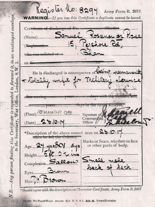 By 1939 Ellen and Moishe Rose had moved further up the road to number 21 Princess Road, Birmingham. In the 1939 Electoral Register he is described as a silk merchant and Ellen a housewife. Living with them was a fifteen year-old youth named Tooh Hans (sic) who was learning some kind of trade. By the end of the war in 1945 they had moved to 233 Pershore Road.
