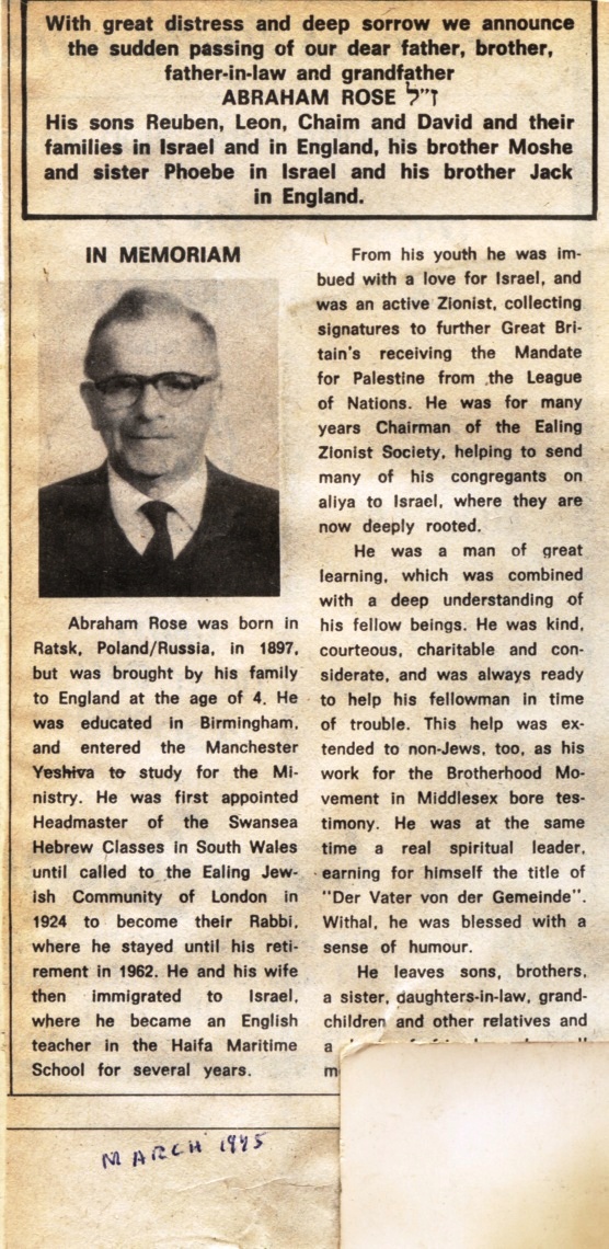 The “Brotherhood Movement in Middlesex” mentioned in the obituary above refers to the Hayes or Botwell Brotherhood, a non conformist interdenominational religious grouping, founded in or around April 1908, which closed down circa 2001. In 1961, the year before Abraham Rose retired to Israel, the Brotherhood had a membership of about 40, and the Sisterhood one of 100, both organizations being non-sectarian and non-political.