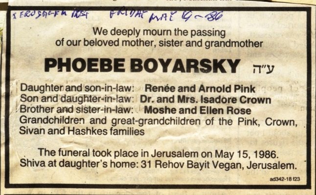 1986 Announcement of Phoebe Crown (Boyarsky)’s death in the Jerusalem PostPhoebe and Philip Crown’s Two Children