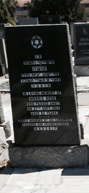 Apparently Moishe Rose donated large sums of money to charity, without his wife’s knowledge, knowing she would disapprove. After he died on 24 October 1988, a memorial service was held in his honour in the synagogue in Petah Tikva, which he used to attend. In his eulogy the rabbi remarked that the synagogue had lost one of its major benefactors. Beryl Lavie, the daughter of Sam Rose, who was present on the occasion, told members of the Rose family afterwards that it was just as well the rabbi had spoken in Hebrew, a language that Ellen did not understand, for had she understood, she would have been most unhappy!