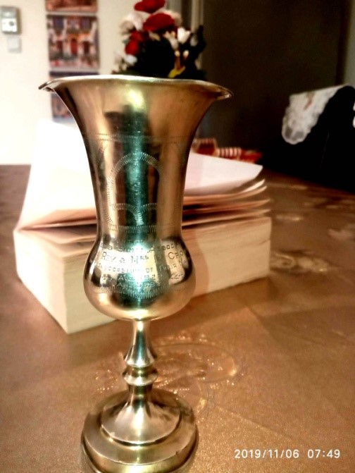 On the occasion of their wedding they were presented with a silver Kiddush cup (for holding the wine that it customary to drink when reciting a blessing) by the Association.