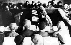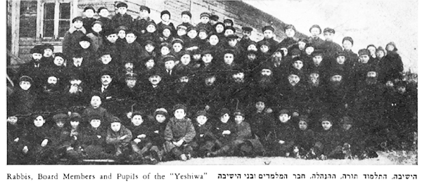 When Hoddes’s sons were older, they probably attended the “modern cheder” in the house of Koppel Berchik. The teacher, whose pale face was decorated by a pointed pitch-black beard, and who wore a top hat and a black bow-tie, was a modernist. He constantly reminded his students that Haim the Melamed’s methods were outdated. As they had done with Haim, his students continued to study the Bible and Gemara (the commentary on the Mishnah or Oral Law which, together with the Mishnah forms the Talmud, the central text of Rabbinic Judaism). However greater emphasis was placed on the modern works of Peretz, Bialik, and Mendele Mocher Sforim. They also studied mathematics and other secular subjects. The older boys no longer thought of playing truant, but preferred to spend their free time practicing for the coming festival. Those who were not chosen to recite poems but had artistic ability were soon busily engaged in painting the background scenery.