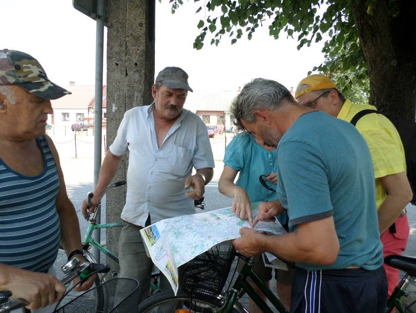 We backtracked through the town asking for information as went. We noticed three men with bicycles lounging in the shade in the town square. One of them spoke a little English. He had spent some time in New York City, not unusual in Poland we found. It was a struggle for him to speak to us in English because he had obviously forgotten a lot. Another man spoke some Russian and, although he was somewhat inebriated, my friend was able to communicate with him. With the help of his friends he managed to explain where the cemetery was. All three men were friendly and willing to help.