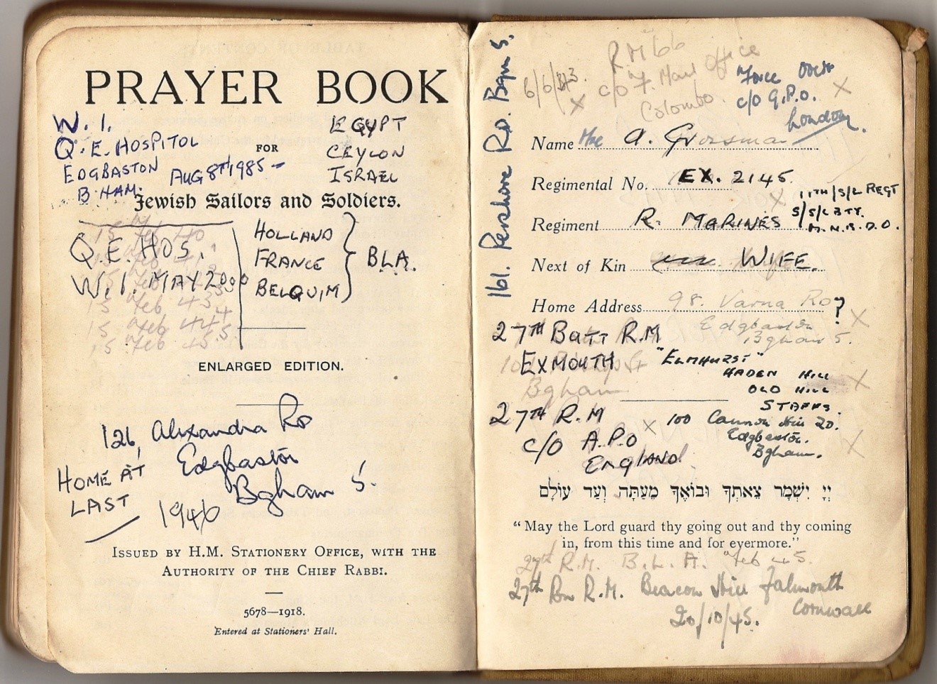 Although it was always widely known that Abe Grossman served in the Royal Marines, a fact reinforced by a number of existing photographs, it was only recently that a copy of his Prayer Book for Jewish Sailors and Soldiers, containing more detailed information, came into our hands. This prayer book, issued in 1918 by H.M. Stationery Office, with the Authority of the Chief Rabbi, was no doubt presented to every Jewish recruit. Since Abe and his wife had no children of their own, we are indebted to his wife’s niece and nephew both for the photographs and for the Prayer Book.
