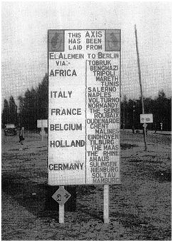 A signpost showing the “route” taken by the 7th Armoured Division on its way to Berlin